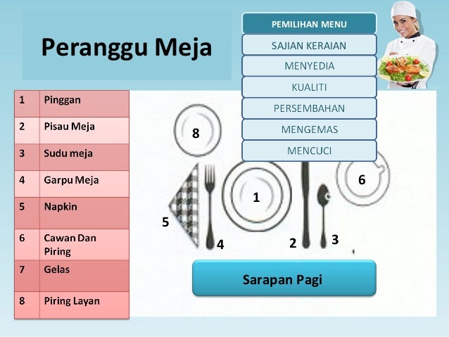 Susun Atur Meja Makan. SUSUN ATUR HIDANGANSusunan Peralatan (Peranggu Meja)Peranggu meja ialah persiapan meja makan yang lengkap dan alatan menghidang dan sesuaidengan susun atur yang betul. PENGENALAN Etiket di meja makan (table manners) - peranan penting - membantu memberi gambaran tingkahlaku dan peribadi seseorang.
